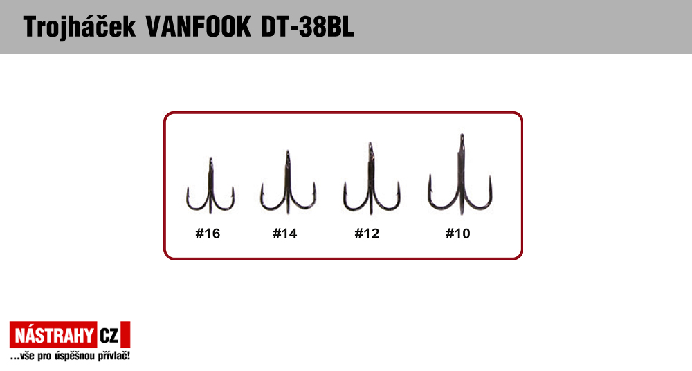 Moderní přívlač už dávno používá i jemné bezprotihroté trojháčky šetrné k rybě. Trojháčky Vanfook DT-38 BL jsou vyrobené z tenčího drátu jako ostatní trojháčky od Vanfooku. Díky tomu se velmi lehce zapichují již při jemném kontaktu s rybou. Trojháčky Vanfook DT-38 BL jsou bez protihrotu a proto jsou vhodné i na závodní přívlač. Navzdory tenkému drátu jsou DT-38BL dostatečně silné i na souboje s velkými rybami a díky špičkové technologii Vanfook si svou extrémní ostrost udrží po dlouhou dobu.