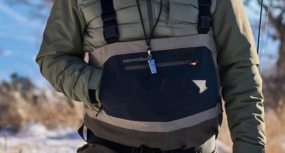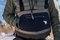- Dvě náprsní úložné kapsy s vertikálním přístupem, navržené pro dvě krabičky na mušky a nadměrné cívky s návazcem.