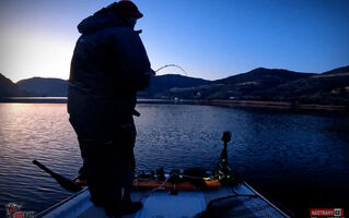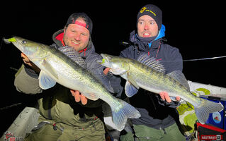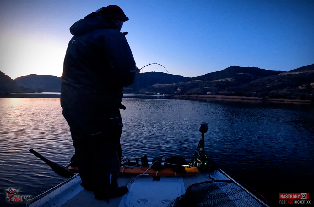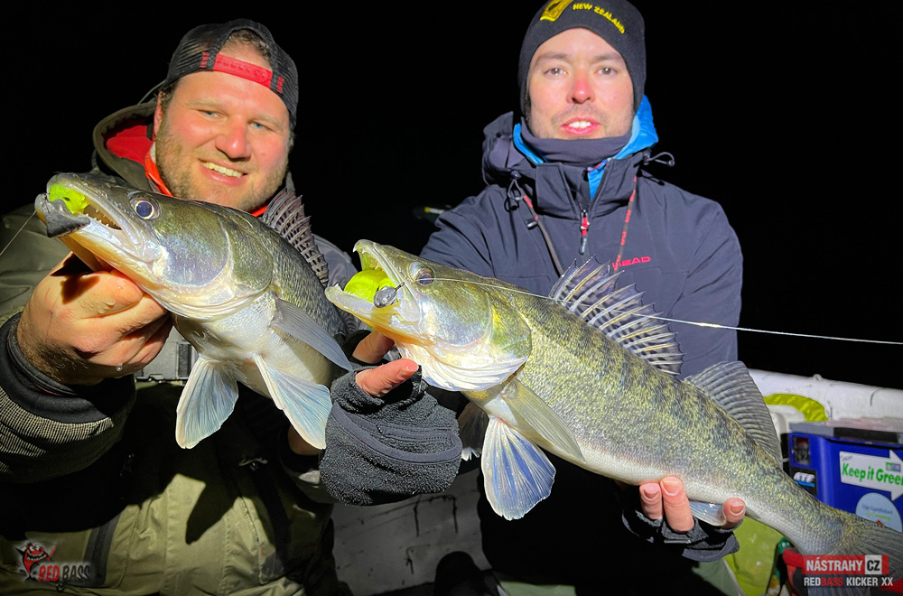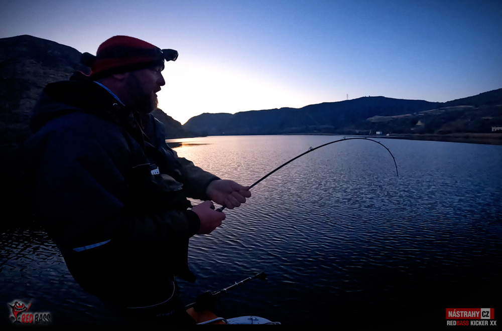 Klaplo to. Vstali jsme a jsme na lodi ještě za tmy. To bude ono! Aktivita je za tmy překvapivě slabší, než bych čekal. První záběry přichází až za rozbřesku. Poměrně rychle chytí kluci celkem šest kousků, já jednoho. Jsem až třetí v pořadí, a tak toho na mě holt tolik nezbyde :-D Chytáme vertikál s kickery a sledujeme na obrazovce naše tři tečky (nástrahy) a ryby (candáty), jak se za nimi zvedají. Teď se jedna zastavila u mě. Obkrouží nástrahu, mohutní a pak reálně vidíme, jak klapne hubou a já cítím v prutu mohutný kopanec. Ještě, než stihnu zaseknout, proběhne mi hlavou: sumec! A velký!!! Po záseku se to potvrdí. Na echolotu navíc vidím dokonale jeho siluetu. A pak to přichází. Sumčí déjà vu. V první fázi si rybu „otestuju“. Hned je mi jasné, že je to opět hodně 2+. Vůbec totiž nejde přizvednout. V druhé fázi se musíme proplést mezi stromy na hloubku. Zabral totiž v téměř stejném místě, jako ten Ondrův včerejší. Jen s tím rozdílem, že to bylo proti tomuhle pouhé „mimino“. Manévr mezi stromy se kupodivu daří. Nyní si sumec v klidu jede po dně, občas se o metr přizvedne, a zase se vrátí. Nyní je času až až. Po poněkud rozporuplných pocitech u giganta z loňska, mu ale víc nakládám. Měl bych tam mít silnější fluoš a chci zdolávání trochu urychlit, abych nevytáhl totálně vyčerpanou rybu. Na druhou stranu jsem opatrný, protože bych ho alespoň rád viděl. Zatím to jde dobře, i když!? Sumec po deseti minutách ožije, jak kdyby někdo zničeho nic přiložil pod kotel. Poměrně svižně se rozjede proti proudu. Snažím se ho korigovat a otočit loď proti proudu, abychom ho následovali a byli nad ním. Vše drží, naděje neumírá… Bzzzzz a najednou šňůra povolí. Smutně jí stočím a zjišťuji, že praskl fluorocarbon ve spoji se šňůrou. Přemýšlím, zda mám být smutný, nebo veselý. Na jednu stranu mohu být spokojen, že netrápím velkou rybou dlouhým soubojem s neúměrně slabým vybavením, na druhou stranu je tu ego a chuť lovce svou kořist zdolat. Mimochodem, tyto pocity mám do dnes. Nedá se nic dělat. Čas vrátit nejde a je to tak, jak to je. Jediné, co mě 100 % hřeje u srdce je pocit, že záběr i souboj je natočen jak na echolotu, tak na další dvě kamery a divák si to jednou fakt užije ???? Dlužno dodat, že návazec byl staršího data, a i když byl silnější, chyba byla na mé straně. Zbytek dne je mimořádně slabý. Plonkový čas využíváme k natáčení podvodních záběrů candátů, jak jen sledují nástrahy, sumců ležících ve stromech apod. Pokud se nepletu, daří se nám i natočit útok candáta na nástrahu. Podvečer je klid až do čtvrt na devět, kdy už je černočerná tma. Slabá aktivita je náhle přerušena dvěma rychlými candáty Ondry, následným prvním dablem (dva candáti současně) Ondry a Honzy. Pak Honza přidává krasavce „ouvr“ (přes 70), několik céček Ondra a i já se dočkám. Vše bere převážně na Kickery v barvě Signal Yellow. Ta doposud funguje až neuvěřitelně dobře a Ondra o ní začíná mluvit jako o „nočním běsu“. Tak uvidíme, kolik jich rozběsní zítra!