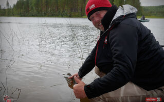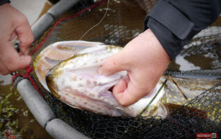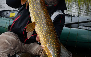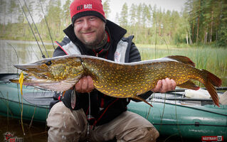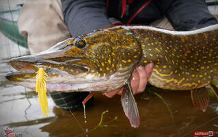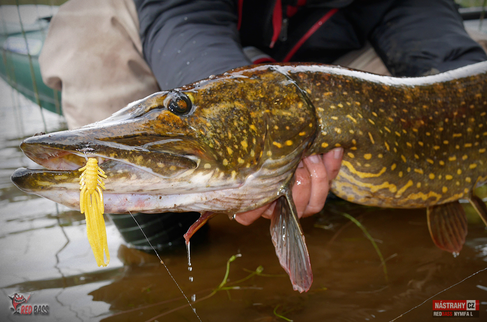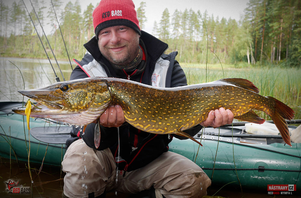 Letos mi ty štiky na “pstruhovej” cajk jdou. Tahle měla 103 cm. Opět klika - z čeburašky vyjela spona a vydržela. První podebrání nevyšlo - štika protrhla podběrák a projela síťkou. Chvíli jsem jí tak zdolával, pak jsem zkusil protáhnout dírou celej prut i s navijákem. Klaplo to. Dalších nejméně 5-10 minut a zakřičel jsem si radostí! :-) díky Svatý Petře!!!