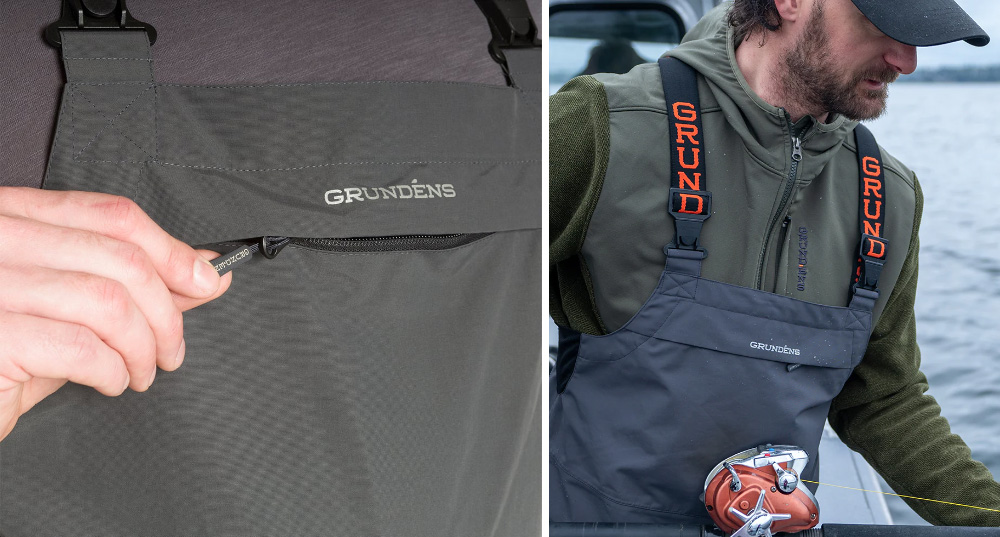 - Zipy na nohavicích: Usnadňují oblékání kalhot přes rybářské boty.