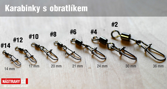 Karabinka s obratlíkem. Kulatý oblouček karabinky zajišťuje dokonalý chod nástrahy ve všech polohách, typ zámku pohodlné otvírání a zavírání a minimální riziko samovolného rozepnutí.