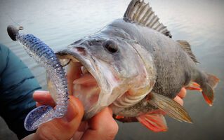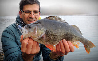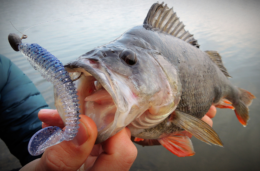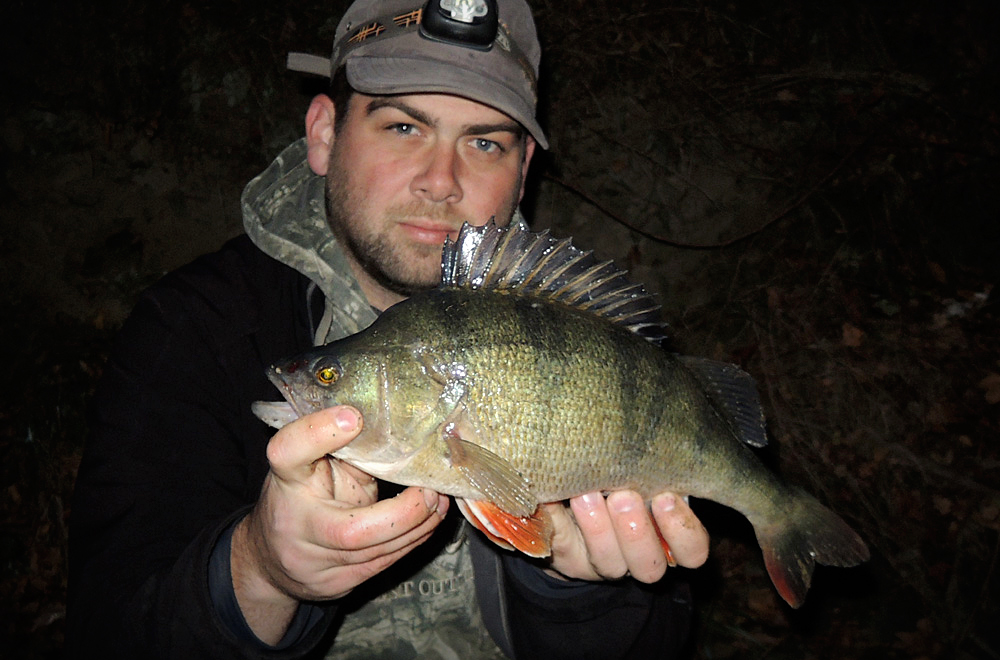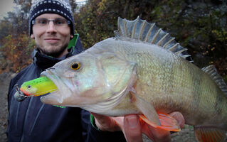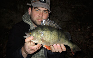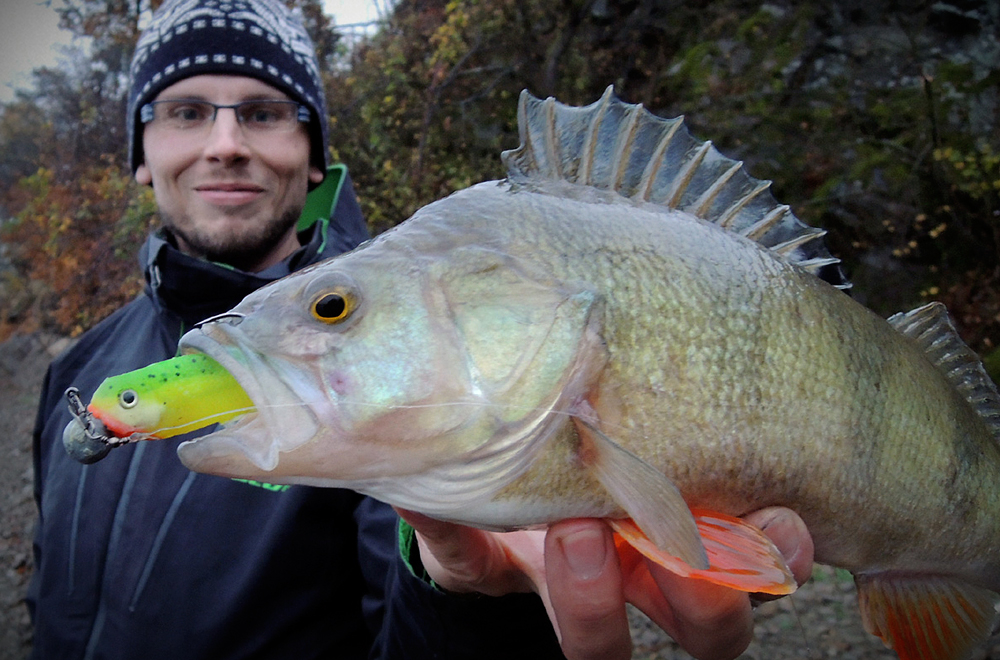 Protože cílová ryba naší víkendové minivýpravy byl candát, nabili jsme větší nástrahy. Ty se však neplánovaně líbily především okounům. Po mém prvním ranním, kterého jsem odhadl na cca 38 cm (při podebírání se vyháčkoval), se podařilo Tomovi chytit jeho bráchu (naměřených 38). Po rozednění mi přímo pod nohami zobnul Magneto 96 mm nádherný pupkáč s mírou dvaačtyřicet! V podvečer ještě Tomík lapl pěknou zubatici a SWIMMER L se zalíbil dalšímu pětatřicátníkovi.
