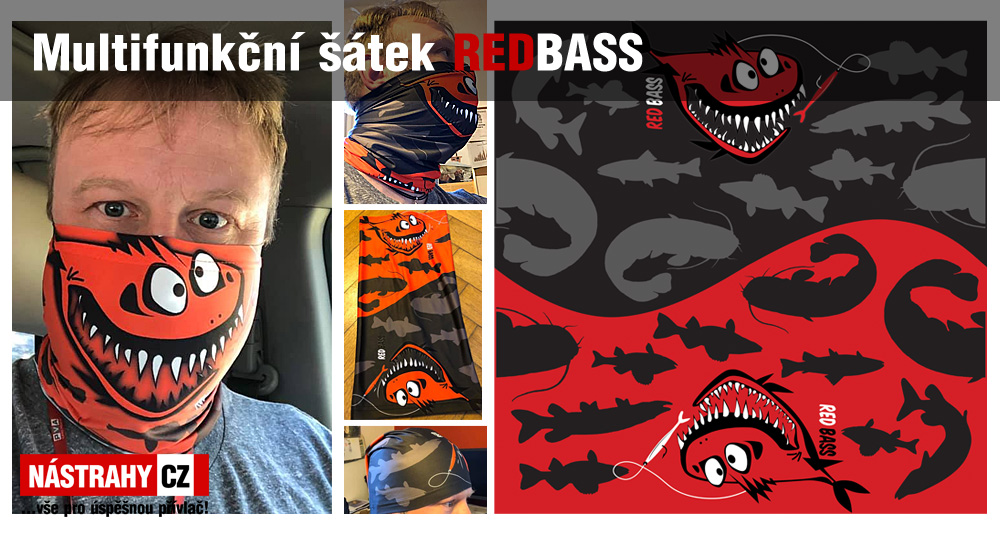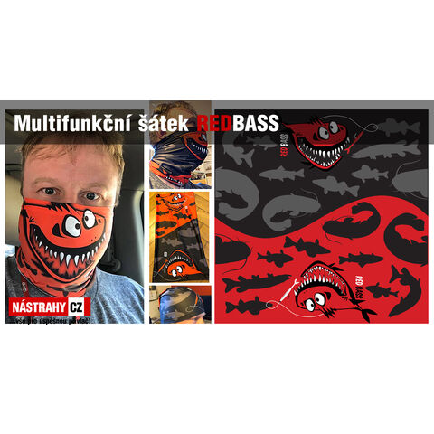 Multifunkční šátek REDBASS pro použití jako nákrčník, šátek, rouška, čelenka apod. Z jedné strany je motiv na červeném podkladu a z druhé na tmavě šedém. Rybář si tak může zvolit, jakou barvu bude mít na ústech/hlavě. Lemy jsou zašité, nehrozí samovolné "rolování". V zimě hřeje, v létě chladí.