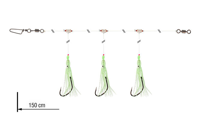 Tento návazec se silnými háčky můžete používat samostatně, nebo jako součást nástrahy. Ideální pro rybolov v Norsku! Rotační kulička zabraňuje zamotání při zdolávání ryby, a tak návazec můžete opakovaně používat. Rotační kulička je vyrobená ze speciálního ABS plastového materiálu a odolá i velmi silnému tahu. Souboj a zdolávání velkých, bojovných tresek bude hračka.