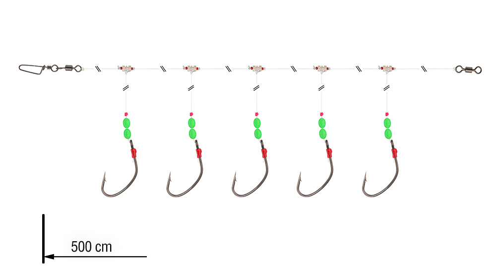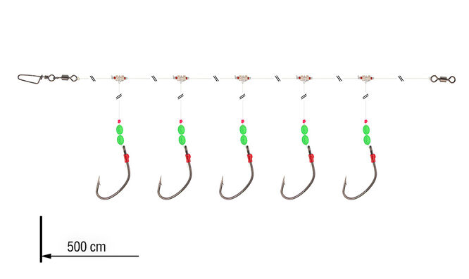 Tento návazec je vyrobený pro lov okouníků ve velkých mořských hloubkách. Rotační kulička zabraňuje zamotání při zdolávání ryby, a tak návazec můžete opakovaně používat. Rotační kulička je vyrobená ze speciálního ABS plastového materiálu a odolá i velmi silnému tahu. Široce tvarované háčky mají ostrý hrot a můžete se na ně vždy plně spolehnout. Svítící korálky jsou pro ryby dalším lákadlem.