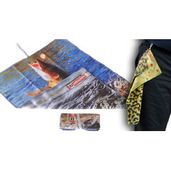 Praktický malý ručník z moderního rychleschnoucího materiálu s poutkem a motivy dravců a pstruhů.