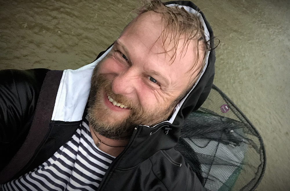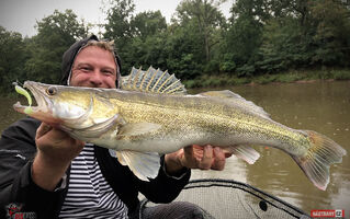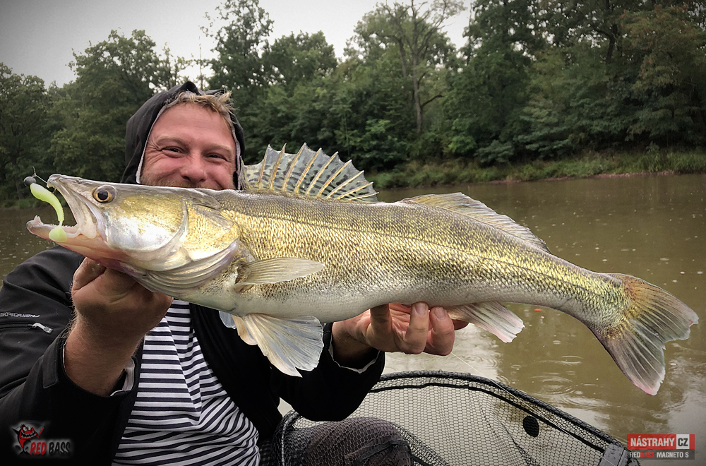 Komu se nelení, tomu se... Předpověď počasí: přívalák. Pohled na meteoradar mi ale napověděl, že nás to jen lízne, nebo se to vyhne :-DDD. Po půl hodině na vodě začalo krápat. Nástraha na dně uvízla a rozjela se. Ani jsem na Ondru nevolal, neboť jsem očekával podšvihlého kapra. Po několika minutách boje, který vypadal na onoho šupináče, se ryba ukázala na hladině - takový polo štičí výskok. Tak nějak se mi zdálo, že je to candát, ale moc jsem nevěřil. Ovšem tajně doufal a opatrně zdolával. No a do svého podběráku jsem pak zdárně přivedl tohoto krasavce v parádní kondici. Fotky už vznikaly za pěkného slejváku. Puštění bylo rychlé - candát nás skropil, jak kdyby hodinu odpočíval. Parádní zážitek.