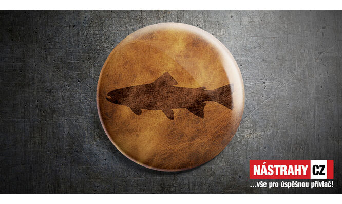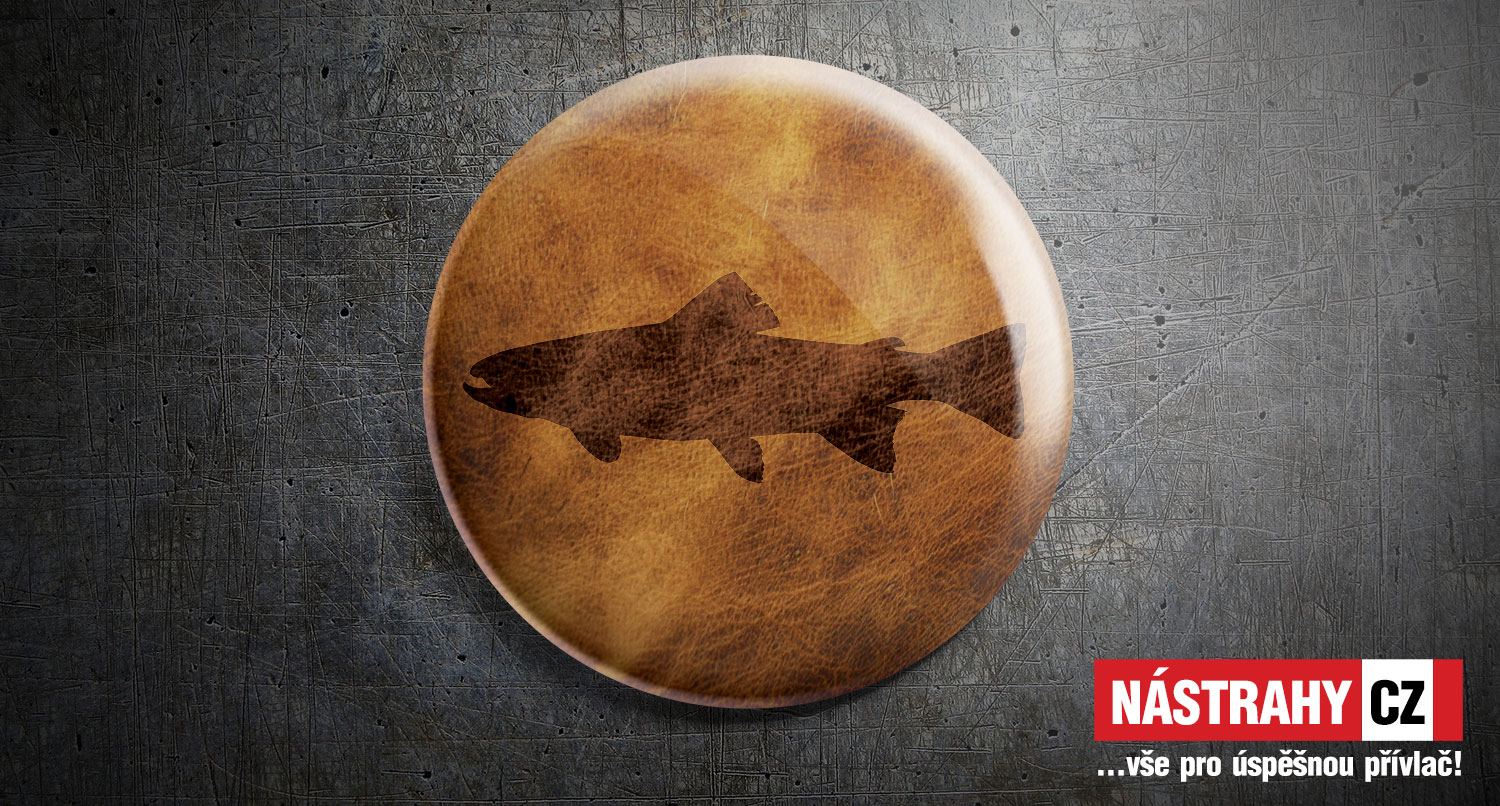 Placka (odznak) pro milovníky rybaření s motivem siluety pstruha.