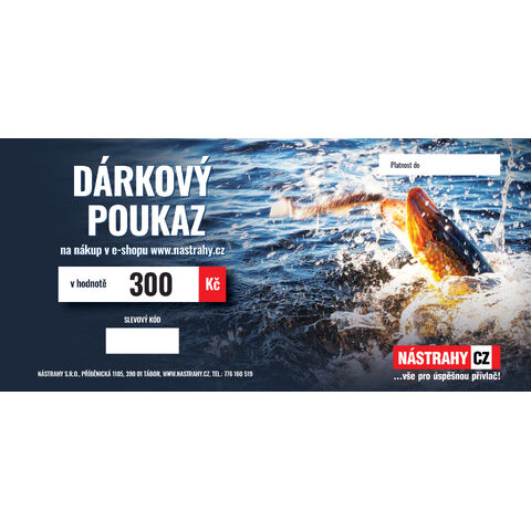 Poukaz v hodnotě 300,- Kč k nákupu zboží v obchodě NASTRAHY.CZ s roční platností. Po zakoupení této poukázky Vám bude na Vaši adresu zaslán certifikát s kódem. V případě Vašeho zájmu zašleme vytištěný na ozdobném papíře.