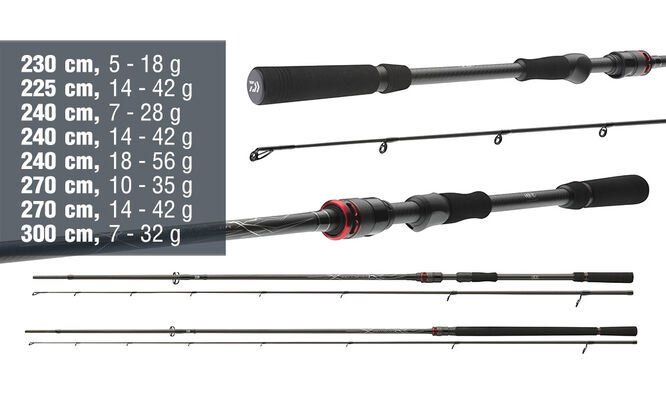 Pro všechny milovníky čistě gumových nástrah jsou k dispozici modely s vrhacími zátěžemi 7 – 28 g, 10 – 35 g, 14 – 42 g a dokonce 18 – 56 g. Tenké, extrémně rychlé a tuhé blanky přenášejí každý pohyb nástrahy, kontakt se dnem a každý opatrný záběr okamžitě přímo do ruky.