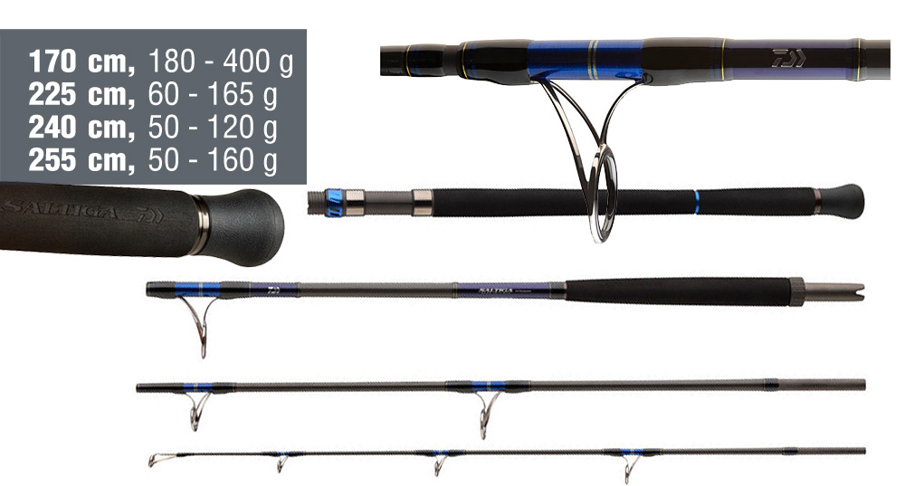 Sortiment řady Saltiga Air Portable nabízí pruty pro nekompromisní použití v tropech a dalších destinacích velkých ryb. Aby byl zajištěn bezpečný lov silně bojujících druhů ryb, jako jsou GT, Tuna, Cubera, Amberjack, Rooster & Co., musí být blank prutu, sedlo navijáku, očka a spoje té nejvyšší kvality. Blank z uhlíkových vláken HVF s technologií X45 je mimořádně odolný - přesné náhozy a kontrola nad prezentací nástrahy jsou samozřejmostí za všech okolností. Páteř prutů Saltiga nabízí obrovské silové rezervy pro kontrolu nad velkými exempláři během zdolávání a jejich odvedení od nebezpečných oblastí a útesů se zcela utaženou brzdou. Špičková akce umožňuje nahazování woblerů na velmi dlouhé vzdálenosti. Dvoupatková K-očka Fuji SiC odolávají i tomu nejdrsnějšímu namáhání. Spoje V-Joint jsou vyztuženy speciálním materiálem z uhlíkových vláken BIAS, což vede k neuvěřitelně robustním spojům s perfektně harmonickou křivkou ohybu. Rozdíl oproti dvoudílnému prutu je těžké poznat! Originální sedla navijáku Fuji s dvojitým šroubením trvale jistí těžké navijáky a zabraňují uvolnění navijáku během souboje. Ergonomicky tvarované EVA rukojeti se příjemně drží, nabízejí optimální přenos síly a zabraňují příliš rychlému vyčerpání během rybolovu. Třídílný model o délce 1,70m byl vyvinut pro rychlé jigování ve středních až velkých hloubkách. Extrémně tuhý blank s vrhací zátěží 180-400g je perfektně vyvážený a nabízí obrovské silové rezervy pro souboj. Vícedílné prut DAIWA Saltiga AP jsou navrženy pro nekompromisní použití v nejdrsnějších podmínkách v tropických destinacích. Transportní délky od 67cm do 78cm umožňují snadnou přepravu v různých zavazadlech - drahé transportní tuby na pruty jsou od nynějška minulostí. V závislosti na modelu jsou tyto pruty také velmi vhodné pro lov tresek a halibutů v Norsku!