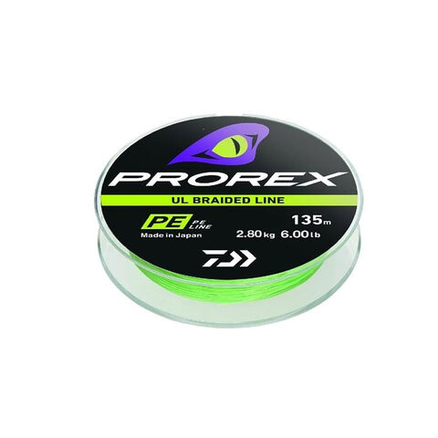 S pletenou šňůrou Prorex UL Finesse Braid nabízí DAIWA velmi tenkou šňůru, vyrobenou v Japonsku, která vykazuje skvělé vlastnosti v ultra lehké a jemné přívlači. Tato excelentní šňůra se dobře hodí na lov, s extrémně malými nástrahami, na okouny, tlouště a pstruhy. Průměr, uvedený na cívce o návinu 135 m, je deklarovaný dle japonských specifikací (mm se neuvádějí!).