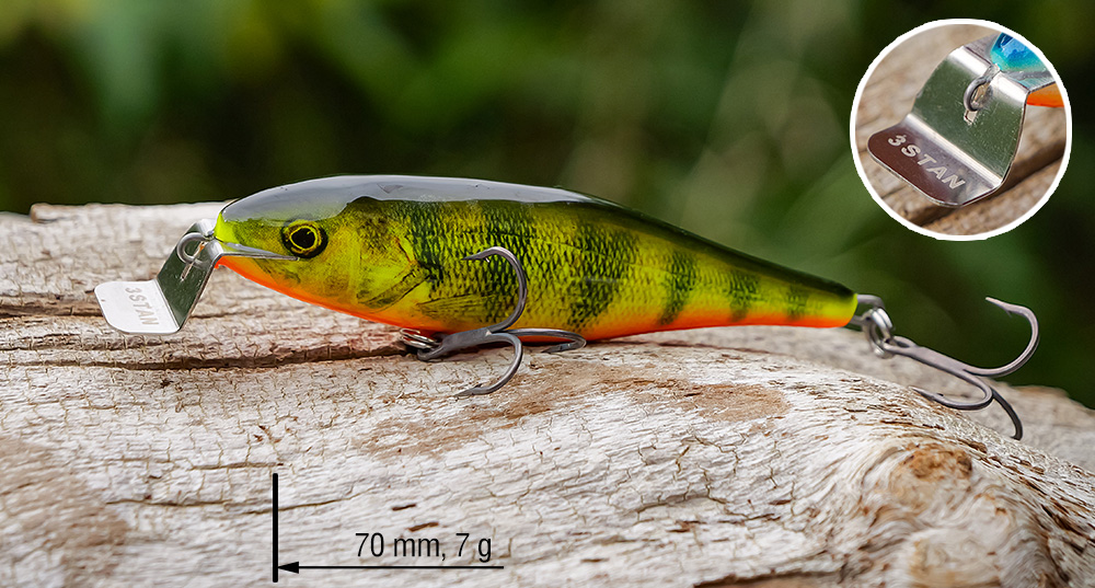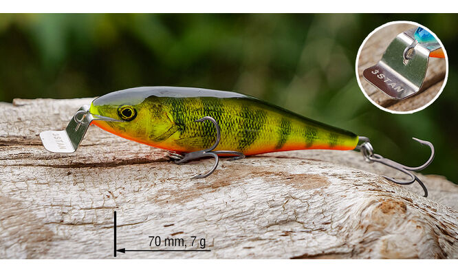 Wobler je účinný na lov velkých okounů, candátů, štik, bolenů a sumců. Hloubka ponoru 0,7-1,2 m