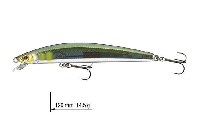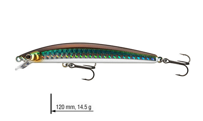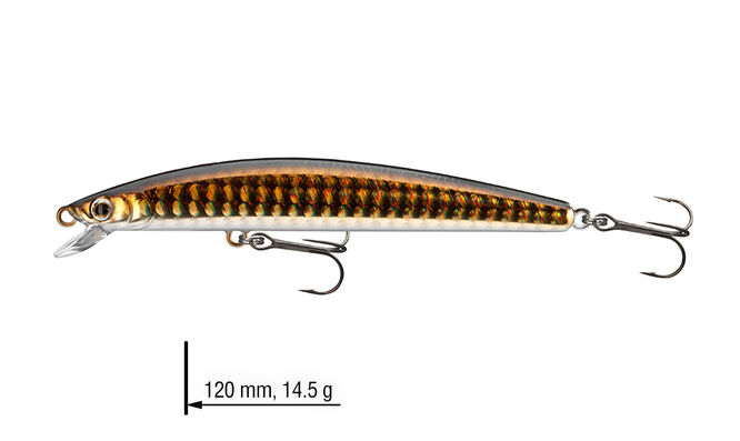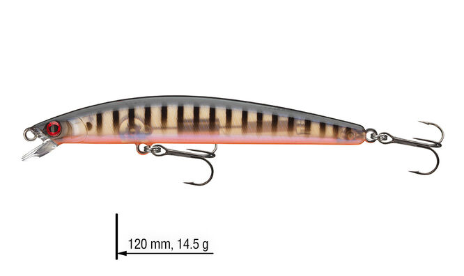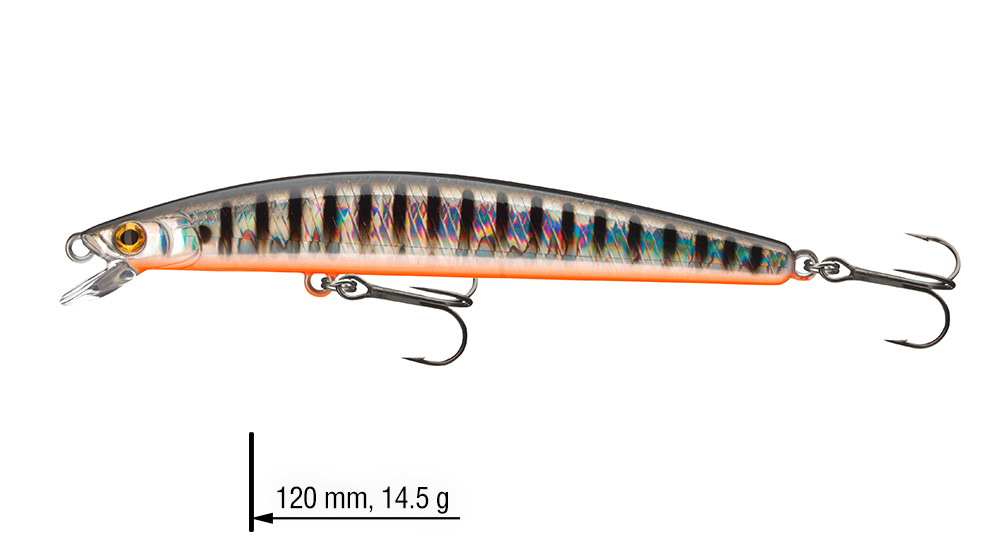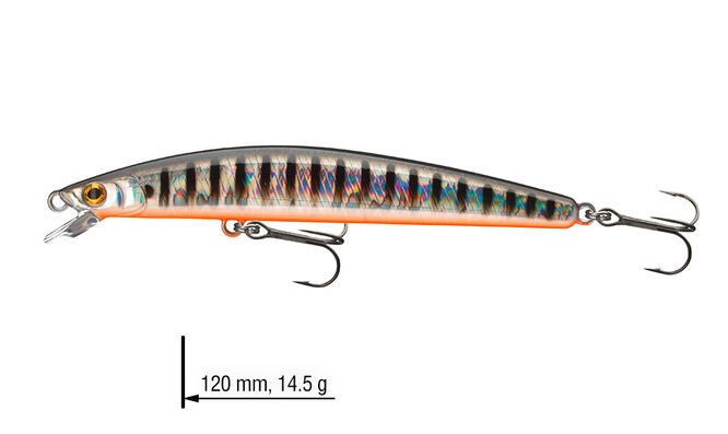 Nástrahy Minnows z řady Tournament jsou navrženy pro cílený lov v horních vrstvách vody. Jsou ideální na lov candátů během noci, nebo když dravci loví blízko hladiny v brzkém létu. Díky bezolovnatému tichému systému G.O.S: Gravity Oscillate System mohou být tyto nástrahy nahazovány s velkou přesností. Perfektní na twitching a jerkbaiting. 120mm model disponuje extra silnými trojháčky.