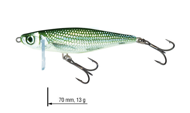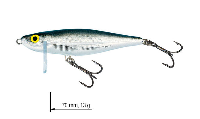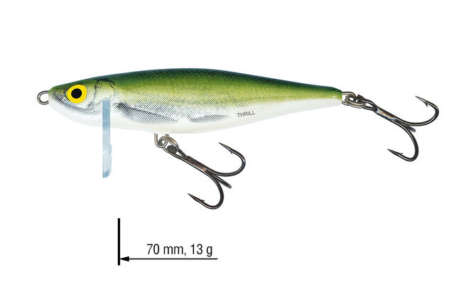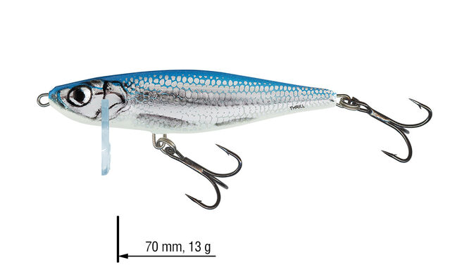 Wobler Salmo Thrill byl původně navržen především pro lov bolenů, ale brzy se ukázalo, že je účinný i při chytání ostatních dravců. Svým vzhledem přesně imituje drobnou, štíhlou, stříbřitou rybu, což přitahuje pozornost mnoha predátorů. Díky tomuto tvaru lze dosáhnout dlouhých a přesných hodů.