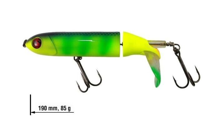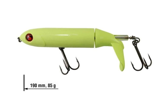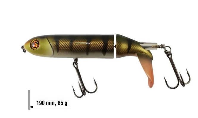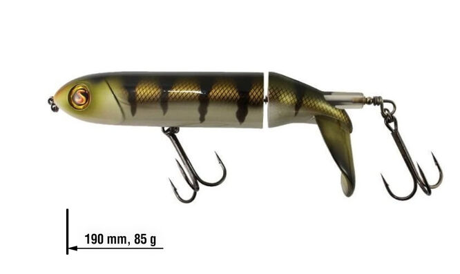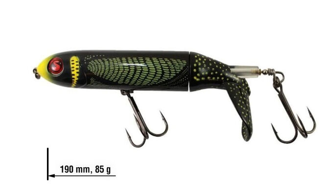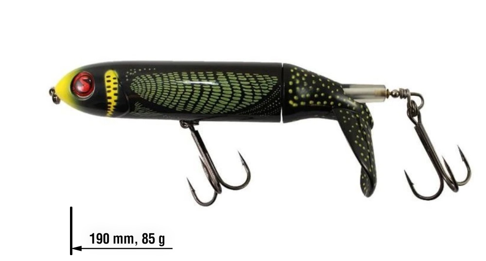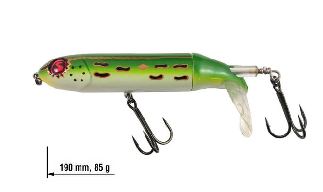 River2Sea Whopper Plopper je velice úspěšná povrchová nástraha, která vydává nízkofrekvenční vibrace lákající dravce v okolí. V zadní části Whopper Plopperu je malý propeler, který i při velice pomalém tažení čeří vodu a nechává za sebou výraznou zvukovou i vizuální stopu.