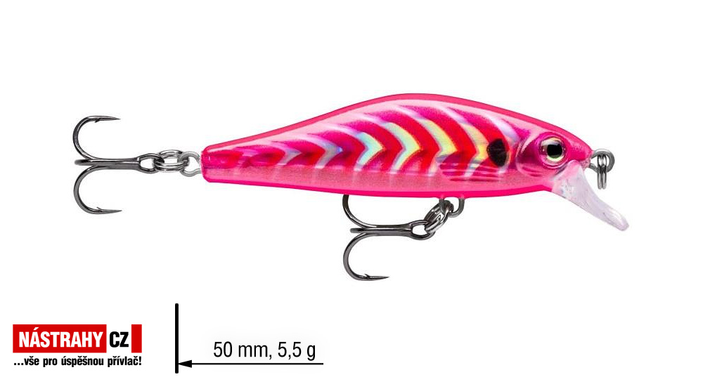 Potápivý wobler pro dlouhé hody. Ponor 0,9 - 1,2 m. Rozměry: 50 mm, 5,5 g.