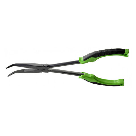 Extra dlouhé a odolné kleště vyrobené z nerezavějící oceli se zahnutými čelistmi. Ideální pro uvolnění hluboko zaseknutých háčků a nástrah. Teflonový povrch omezuje riziko rezivění. Vybaveno ergonomickými, protikluznými úchytkami.