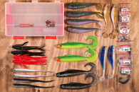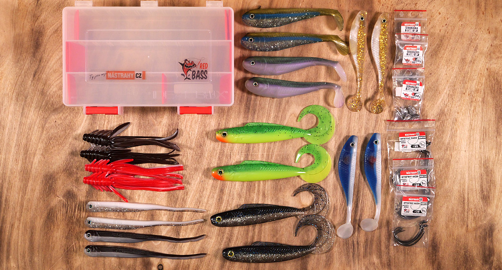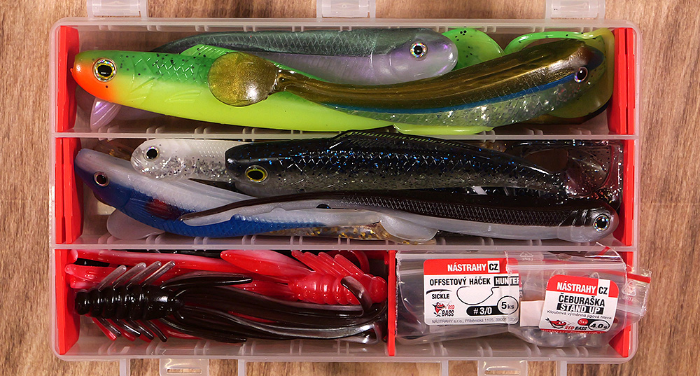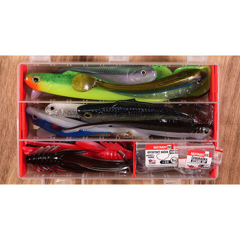 Pečlivě vybraná sada osvědčených nástrah pro lov štik a k nim odpovídající jigové hlavičky nebo čeburašky a háčky vč. krabičky.