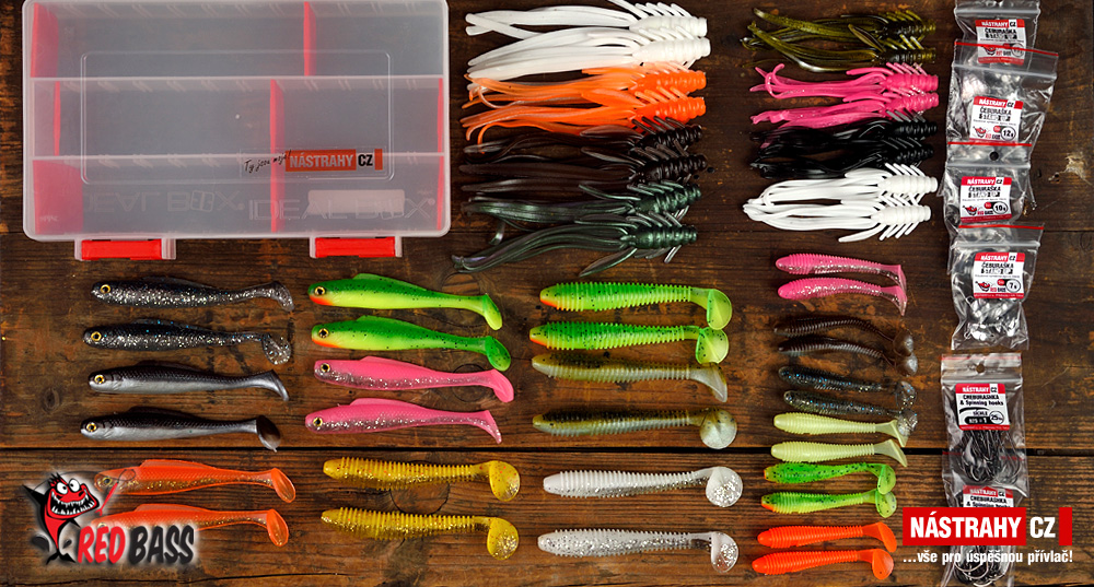 Pečlivě vybraná sada osvědčených nástrah pro lov candáta a k nim háčky a čeburašky vč. krabičky.