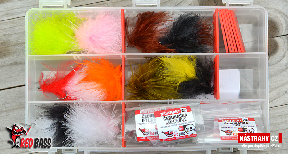 Sada účinných streamerů marabou "čeburaška" a vhodných čeburašek (vyměnitelná kloubová zátěž). Streamer marabou "čeburaška" je účinná netradiční nástraha z jemného peří speciálně vyrobená nejen pro kombinaci s čeburaškou (použit háček s velkým očkem).